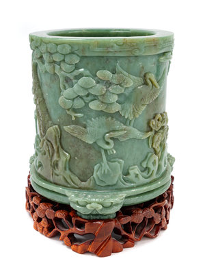 raised on three mythical beast mask form feet, the thick sides carved in relief with a rockery, pine trees and cranes in flight, the stone of greish celadon tone with soft polish, with fitted wood stand.