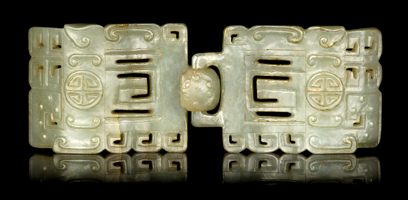 of rounded rectangular form with dragon head, carved in openwork with archaistic motifs and angular scrolls.