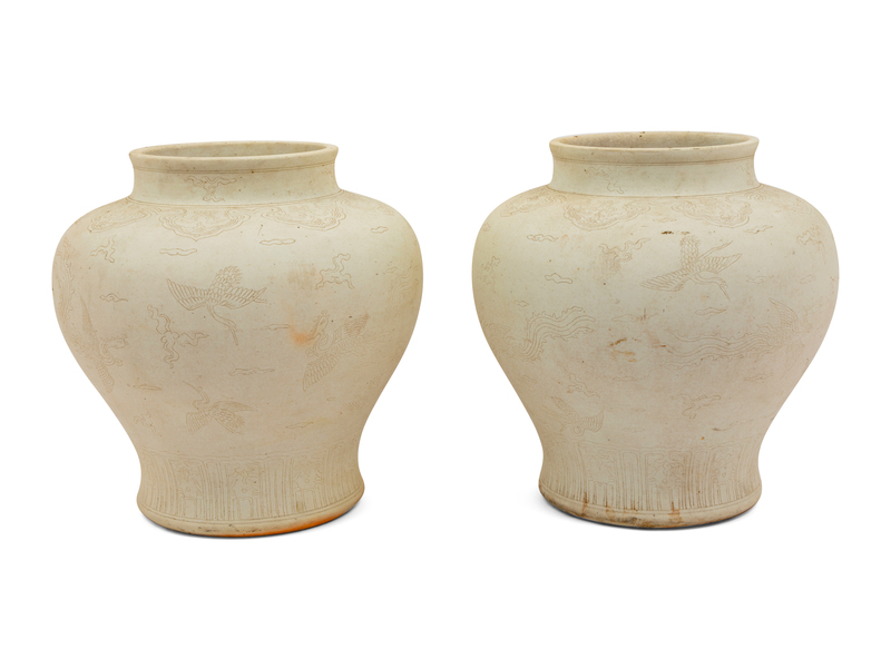 each rising from a flat foot to broad, rounded shoulders and a waisted neck, engraved to the exterior with cranes, phoenixes amongst clouds.