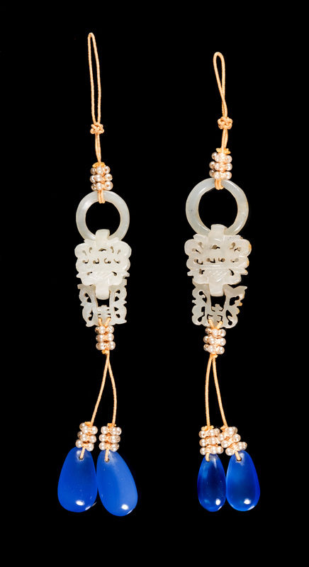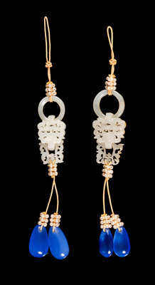 comprising a pair of white jade pendants in the form of rings with beasts masks, suspending pearl seeds and blue glass teadrop-form pendants.