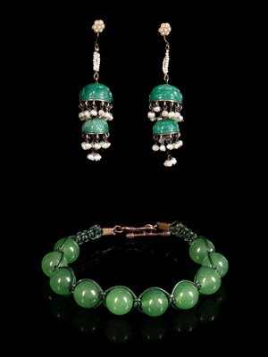 each earring comprising four jadeite pendants with pearl seeds, the braclet with ten jadeite beads.