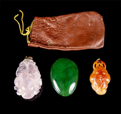 comprising a russet jadeite catfish-form pendant, a rose quartz fruit-form pendant and a large spinach jade cabochon.