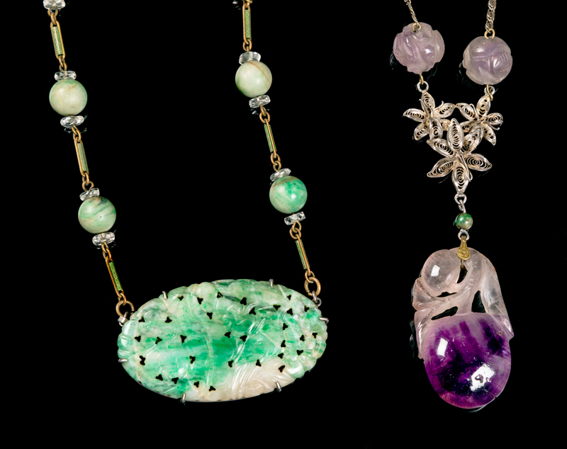 the first with a jadeite pendant and jadeite beads, the second with an amethyst fruit-form pendant and amethyst beads.