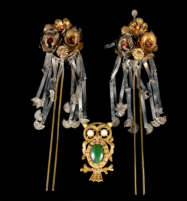 comprising a pair of Japanese hairpins designed as cherry blossoms, and a brooch in the shape of an owl, mounted with jade and pearls.