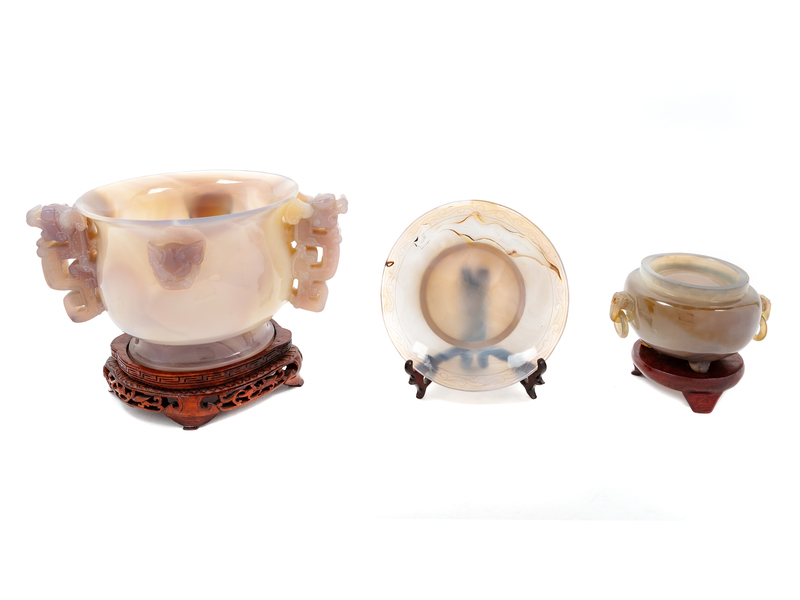 The first a censer example with rounded sides rising from a spared foot to a spreading a mouth, applied with a pair of mythical beast carvings and flanked by a pair of S-shaped chilong handles, the second a censer example with compressed globular body, the shoulder with a pair of animal masks supporting ring handles, the third a bowl example, incised to the exterior mouth rim with foliate decoration, each stone of translucent beige and lavender tone, with fitted wood stands.