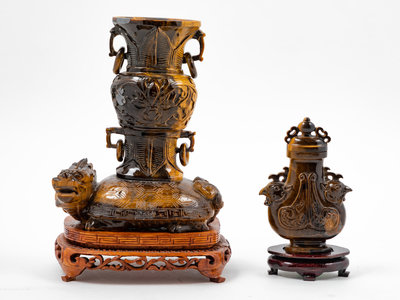the first a figural-form vessel depicting a mythica beast carrying a vase, the second of archistic form, carved with stylized phoenix decoration.