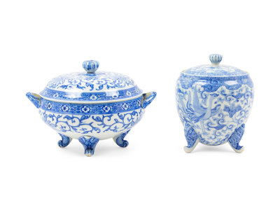 Two Japanese Export Blue and White Porcelain Tripod Covered Vessel