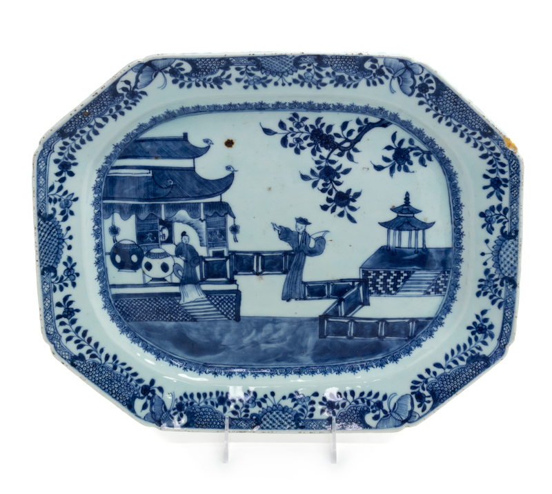 of octagonal form painted with figures on a terrace, surrounded by a border of florets.