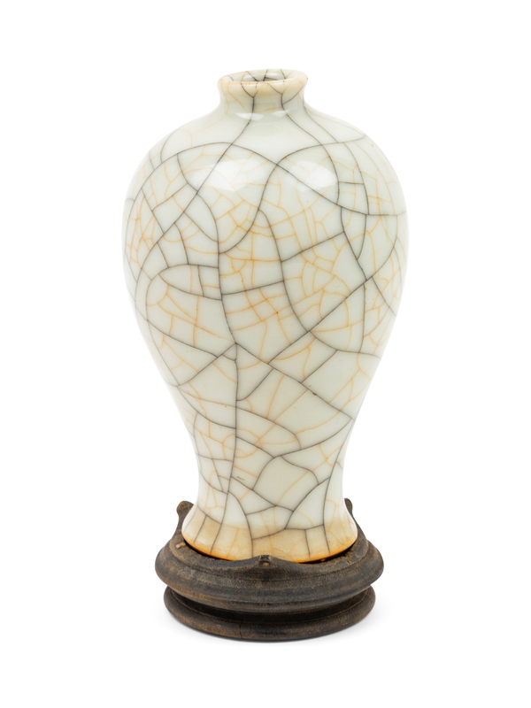 the tapering body with rounded shoulder rising from a spreading foot to a short narrow waisted neck, covered overall in a grey glaze suffused with a network of russet-brown crackle.