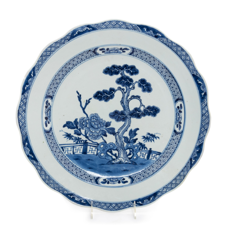painted to the interior to show a fenced garden with a tall pine tree and flowering peony emerging from rockery, enclosed by two diaper borders.