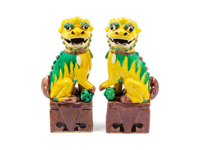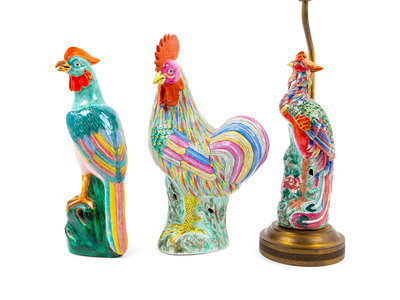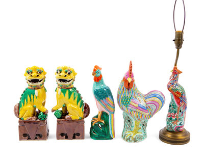 comprising a famille rose figure of a rooster, a famille rose figure of a pheasant, a pair of sancai glazed figures of fu lions, and a famille rose figure of phoenix mounted as a lamp.