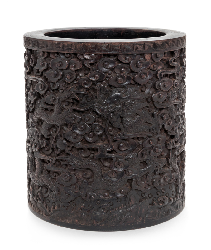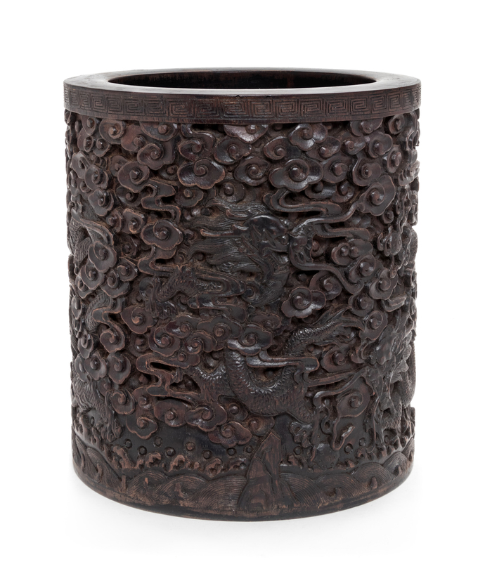 of cylindrical form, the exterior densely carved to show a dragon amongst clusters of clouds.
