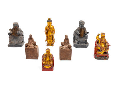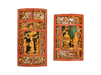 comprising figures of Guanyin and Guangong, and two red lacquered and gilt would panels.