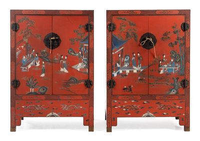 A Pair of Chinese Red Lacquered Wood Cabinets