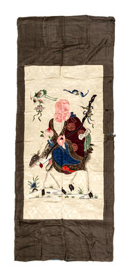 of rectangular form, worked to the center showing the immortal of longevity, Shoulao, riding a donkey, carrying a peach and a staff, underneath a flying crane and a bat, all set above a beige ground.