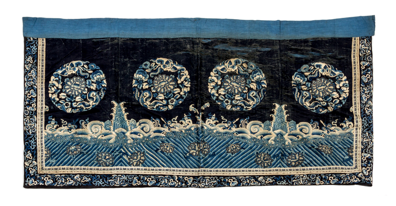 of rectangular form, worked in blue and white threads depicting four floral roundels above mountain peaks and ribbon-tied Buddhist emblems emerging from crashing waves and lishui, all picked out on a black ground, the borders embroidered with floral scrolls.
