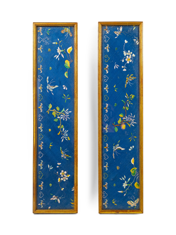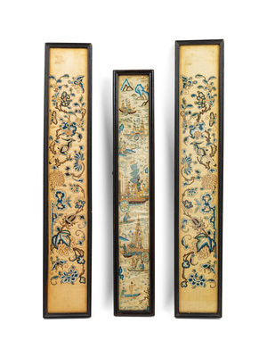 comprising a beige ground pair embroidered with flowers and bird, a blue ground pair embroidered with butterflies and leafy branches, together with a mall silk cuff embroidered with boats on the river.