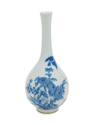 the pear-shaped body rising from a short straight foot to a cylindrical neck with everted rim, painted with rockery and chrysanthemums, peonies and narcissus, with a bird in fly.