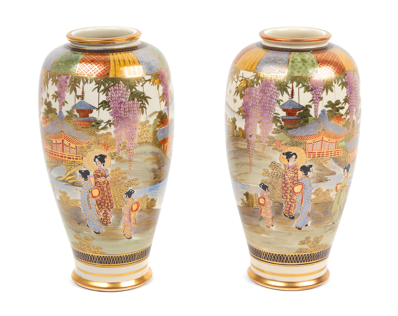 of slender oviform, each decorated in enamels and gilt with complimentary continuous scenes of ladies and children in a garden.