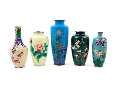 each inlaid in various thicknesses of silver wires and various colored enamels depicted flowers, birds and goldfish.