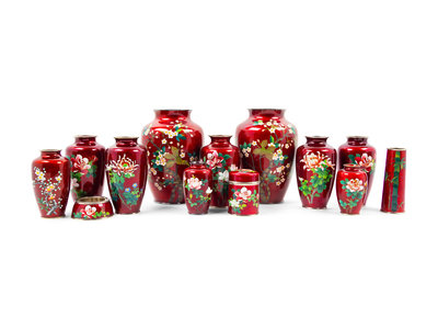 A Collection of Thirteen Japanese Red Ground Cloisonné Articles