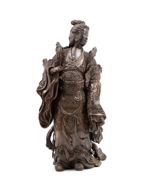 cast wearing long robes and face looking in downcast with serene expression, her hair piled into a tall topknot and adorned with the a jewelled crown.