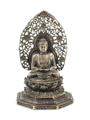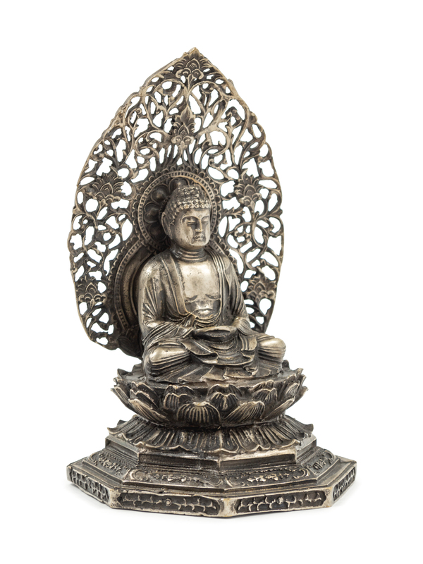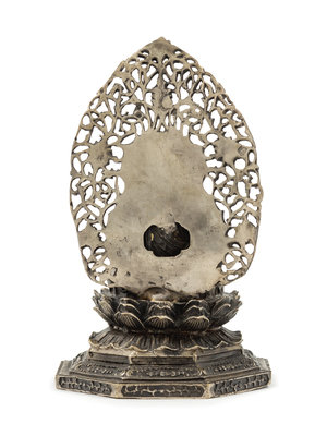 the figure depicted seated on a double lotus plinth, dressed in draped robes, backed by a large reticulated mandala.