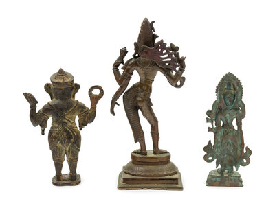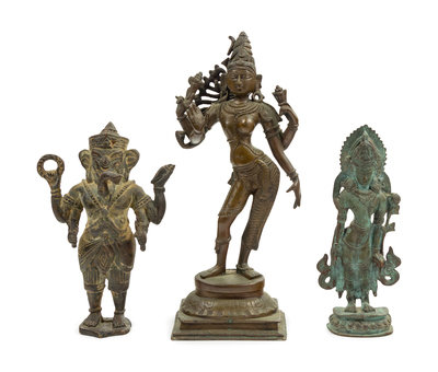 each standing, the first cast with an elephant head, the second on a lotus plinth, wearing a loose dhoti, the third in a dancing posture.