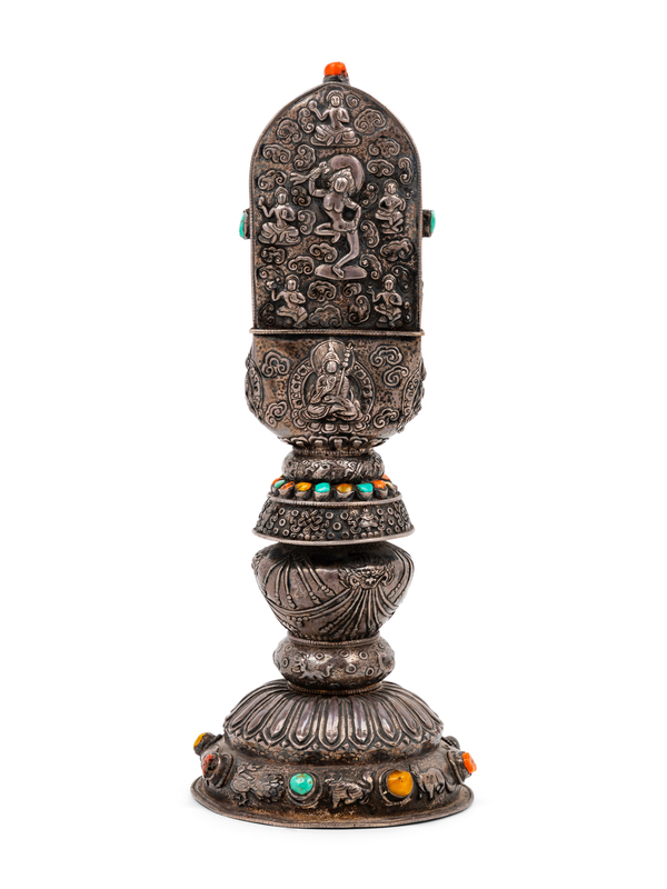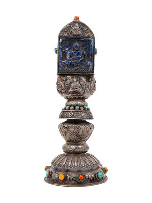 cast with seated buddhas and embellished with coral, turquoise and lapis lazuli.
