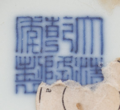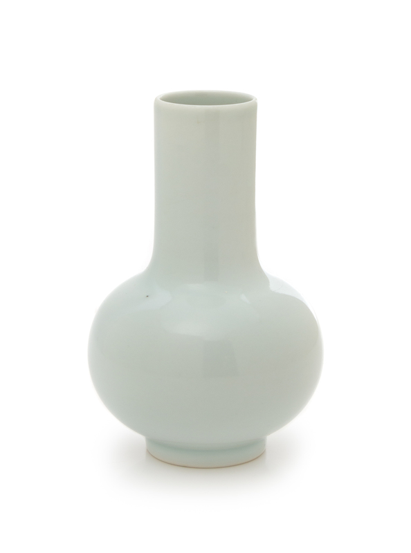 of globular form rising from a short straight foot to a cylindrical neck, the exterior applied overall with a rich white glaze, the base bearing a Qianlong six-character seal mark in underglaze blue and of the period.