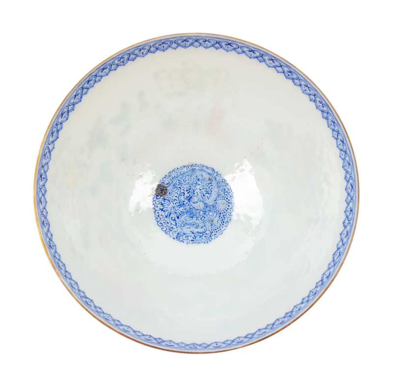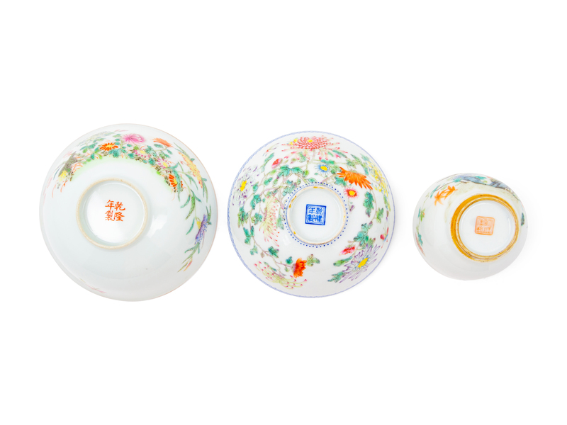 the first an egg shell porcelain bowl decorated with floral blossoms, bearing an aporcyphal Qianlong mark to the underside in blue enamel; the second a bowl decorated with flowering plants, the underside bearing an apocryphal Qianlong four-character iron red mark; the third a teacup, painted to show a bird in flight above flowering branches, the underside bearing a Tongzhi six-character iron red mark.