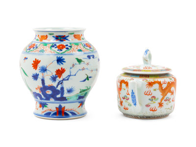 the first an underglazed blue and wucai jar, decorated with birds perched on flowering branches, the second a 'dragon' covered sugar bowl, the underside bearing a Guangxu six-character iron red mark.