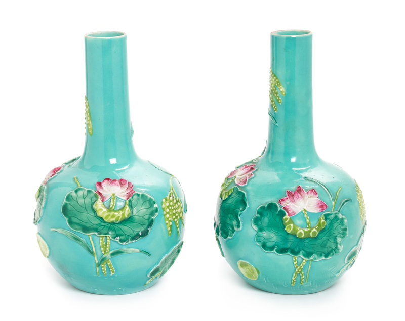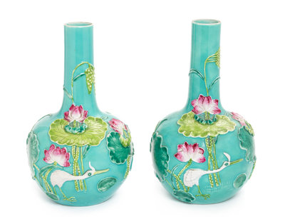 each having a globular body, carved with water birds underneath lotus blossoms, picked out on a green ground.