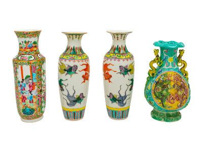 comprising a Canton enamel example painted with laddies and boys, a turquoise glazed example with dragon relief, and a pair of Republican style vases decorated with goldfish.