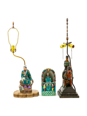 comprising a seated scholar figure mounted as a lamp, a turquoise glazed seated Immortal with servants, and a horse riding figure mounted as a lamp.