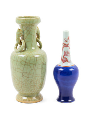 the first an underglazed red and blue glazed bottle form example, decorated with crouching dragons, the underside bearing an apocryphal Kangxi six-character mark in underglaze blue; the second a ge-type celadon ground example.