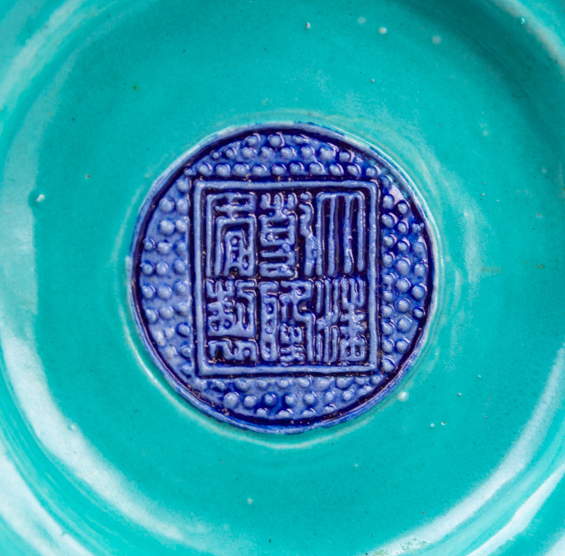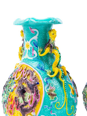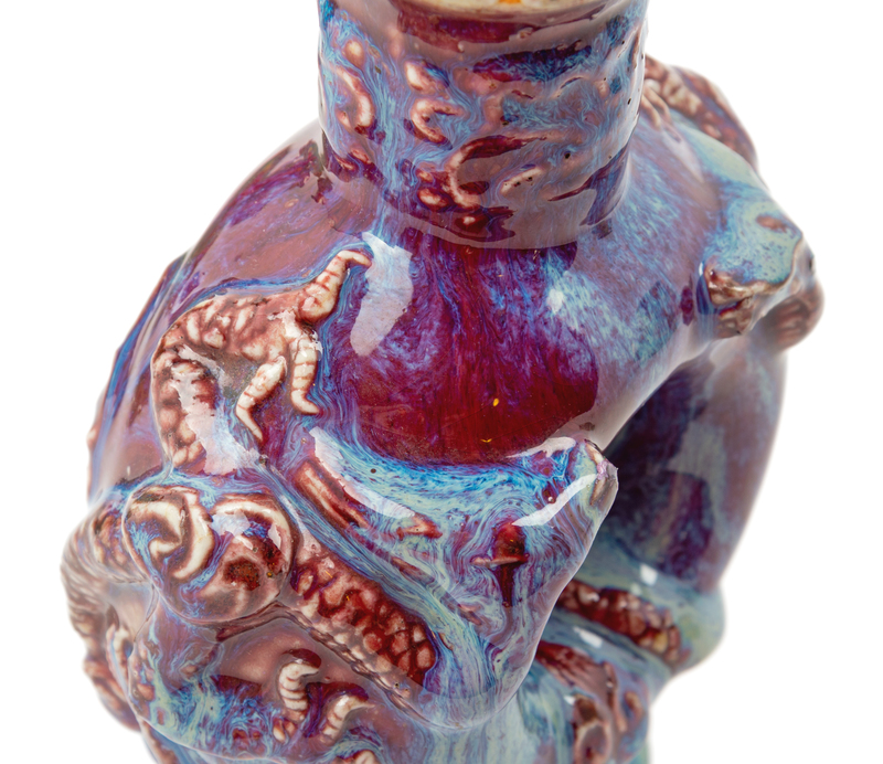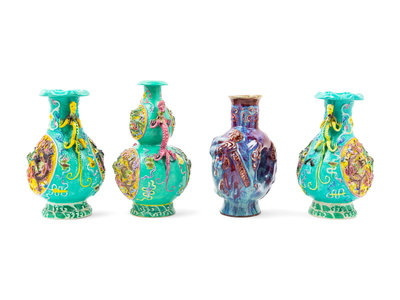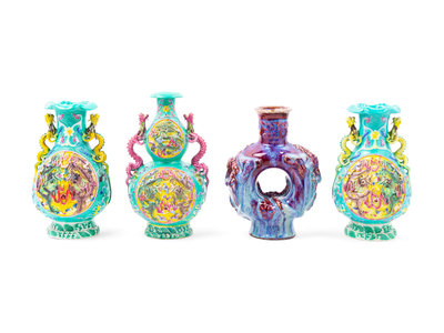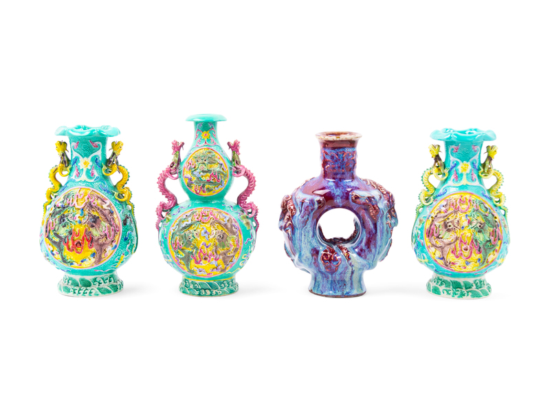 three having globular bodies, carved in relief showing various dragons, the underside bearing an apocryphal Qianlong six-character mark, together with a flambe example.
