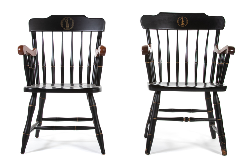 The shaped crest centered by a gilt-stenciled medallion inscribed UNIVERSITY OF VIRGINIA 1819, over parcel-gilt and ebonized spindles above the saddle seat, raised on bamboo-turned legs joined by stretchers; the reverse with brass plaque inscribed 'Thomas E. Martin, Jr.'49 President Alumni Association of the University of Virginia 1968-69'.