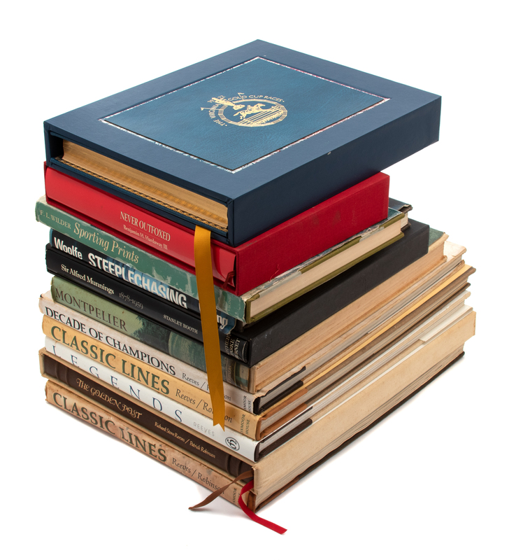 Including: Richard Stone Reeves/Patrick Robinson, The Golden Post, Book number 854 of 2000, published by Fine Arts Enterprises, Ltd., September 15, 1985, signed by the authors. F.L. Wilder, Sporting Prints, Viking Press, NY,1974; Stanley Booth, Sir Alfred Munnings, 1878-1959, Sotheby Parke Bernet Publications, 1978; Benjamin Hardaway III, Never Outfoxed, published by the author, with inscription by the author, July 25, 1998; Gerald Strine, Montpelier- The Recollections of Marion duPont Scott, Charles Scribner's Sons, NY, 1976; Raymond Woolfe, Jr., Steeplechasing, Viking Press, NY, 1983; William Myzk, The History& Origins of the Virginia Gold Cup, book number 174 of 500, Piedmont Press, Virginia; with inscription from the author; Richard Stone Reeves, Classic Lines- A Gallery of Great Thoroughbreds (2 copies), Oxmoor House, Inc., Birmingham, 1975, number 20579 and 18868, signed by the author; Richard Stone Reeves/Patrick Robinson, Decade of Champions, published by Fine Arts Enterprises, Ltd., 1980; and Edward L. Bowen, Legends, The Art of Richard Stone Reeves, Oxmoor House, Inc, Birmingham, 1989.