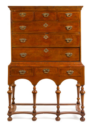 In two parts, the superstructure having a molded projecting cornice above three aligned short drawers and three graduated long drawers, the base fitted with three short drawers raised on cylindrical tapering legs ending in bun feet and joined by undulating stretchers.