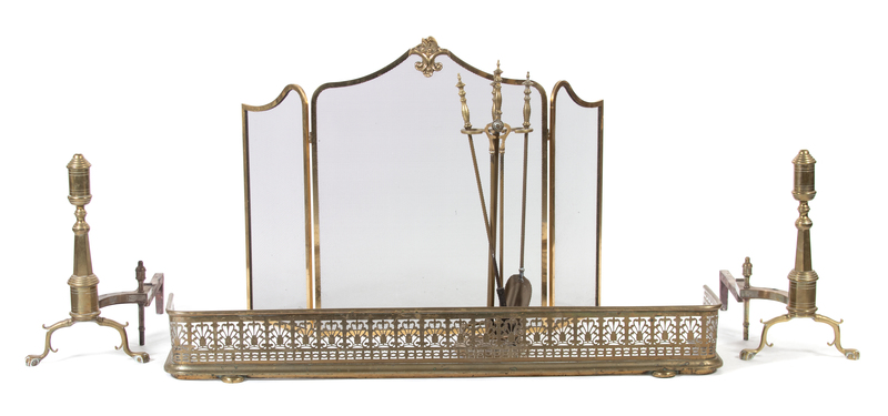 The brass andirons of baluster form, raised on cabriole legs ending in claw and ball feet; the pierced brass fender of rectangular form with rounded corners, the three-panel gilt-metal firescreen of arched rectangular form.