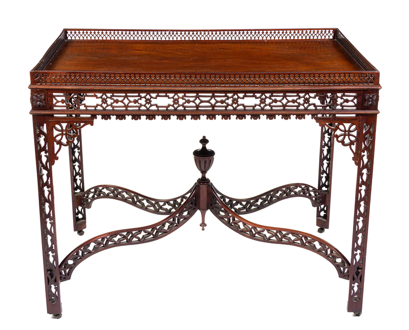 The rectangular top with a pierced gallery above the openwork frieze, raised on openwork legs joined by a curved X-form stretcher centered with a fluted urn.