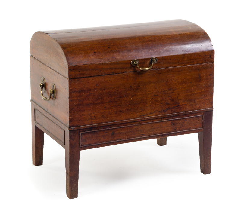 The domed hinged top above the conforming case with bail handles at the sides, raised on square tapering legs.