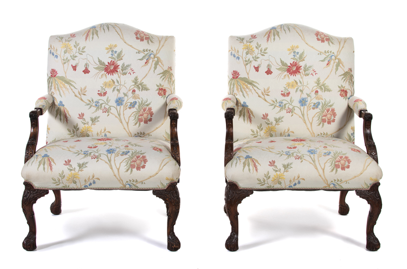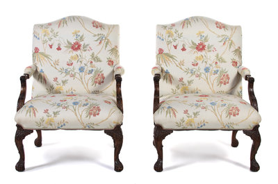 A Pair of George III Style Carved Mahogany Library Armchairs