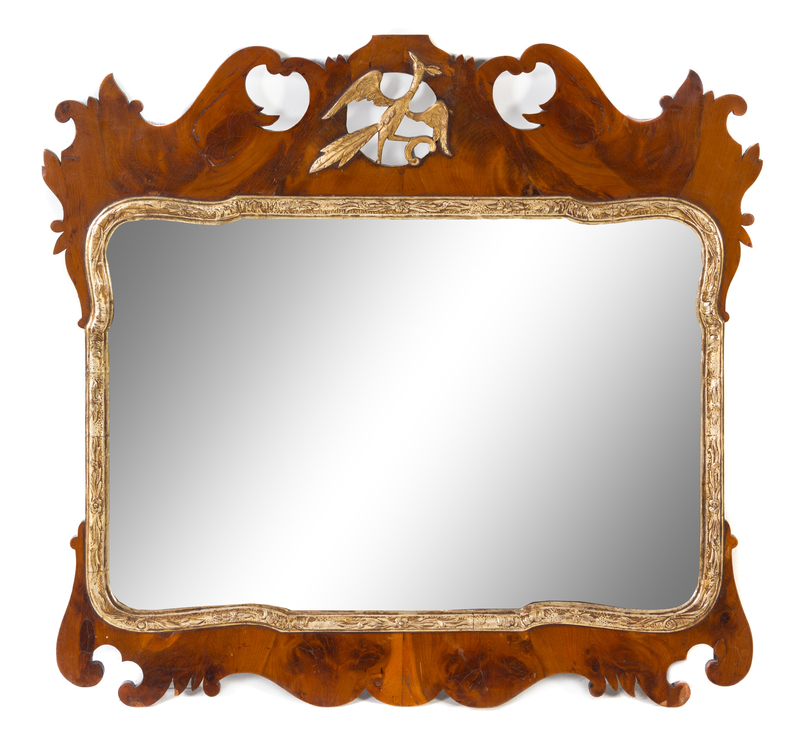The shaped openwork crestrail centered by a Ho-Ho bird above the conforming mirror plate.