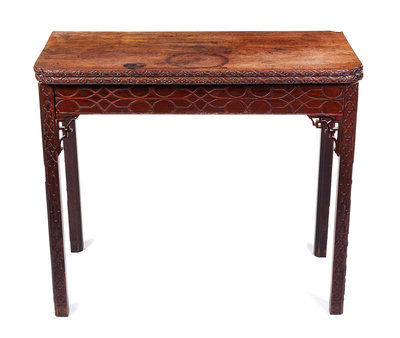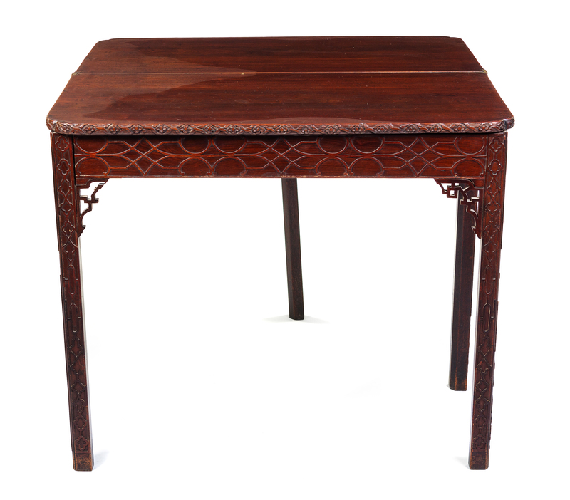 In the Chinese Chippendale taste, the hinged rectangular top with rounded corners above the blind fretwork carved frieze, raised on similarly decorated straight legs.