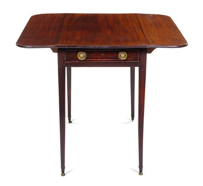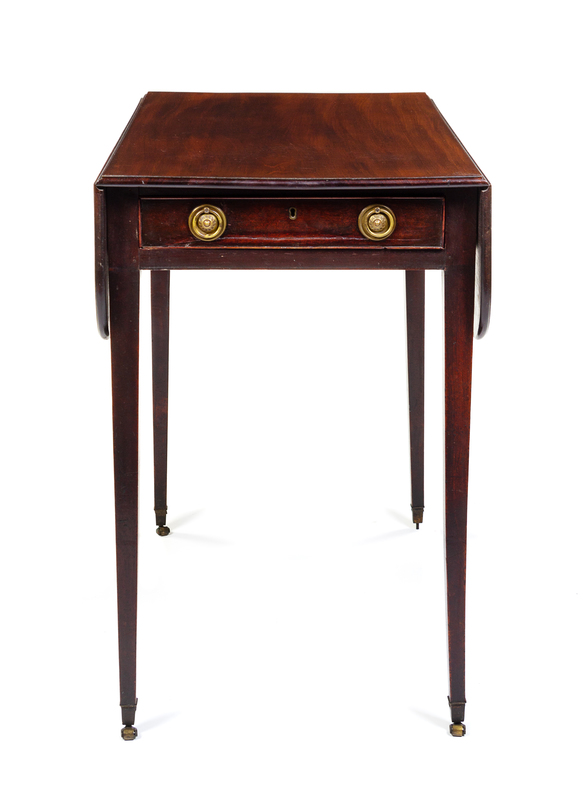 The rectangular top with D-shaped leaves above a frieze drawer at one end, a false drawer on the other, raised on tapering square legs on brass casters.