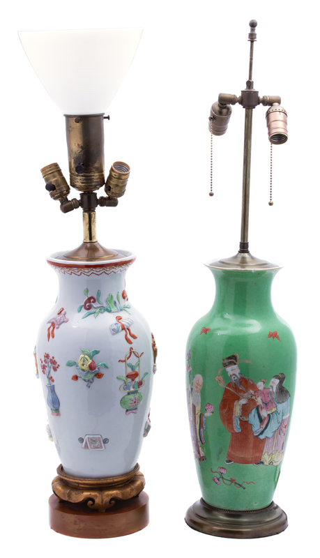 20TH CENTURY The first of shouldered ovoid form decorated with figures of an emperor and sage on an apple green ground, the second molded in relief with flower-filled urns and precious symbols on a white ground, raised on a giltwood stand on a circular base. Height excluding fittings 17 1/2 and 15 inches.