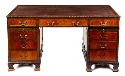 The rectangular inset leather top with gadrooned edge above three frieze drawers and two banks fitted with drawers on either side, raised on foliate carved bracket feet.