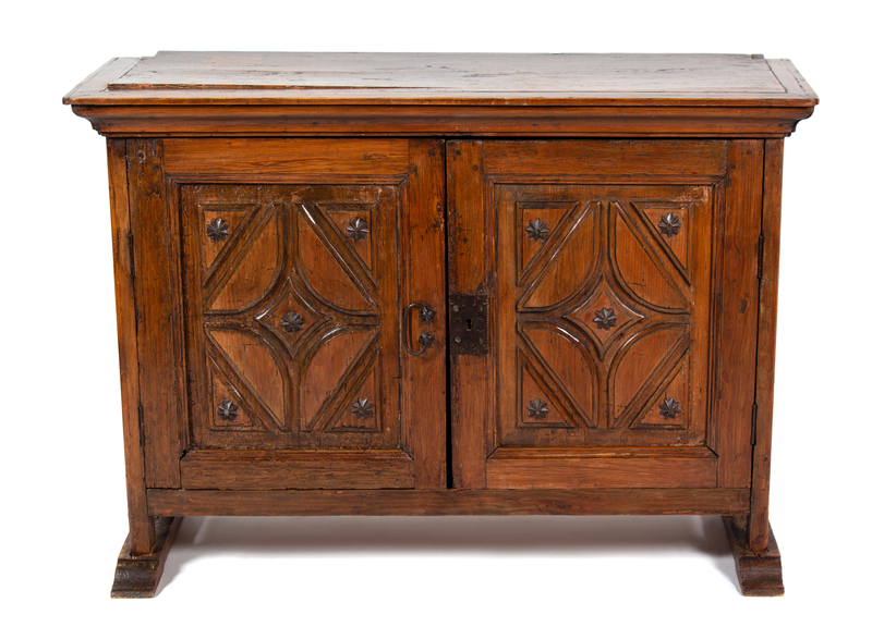 The rectangular top above a pair of cupboard doors mounted with patinated metal stars, enclosing a shelf, raised on sleigh feet. Height 36 x length 50 1/2 x depth 17 inches.